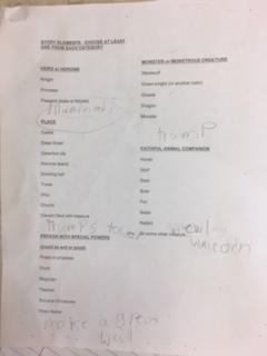 I also give them a Story Element sheet with categories like Hero or Heroine (knight, princess, peasant); Place (castle, deep forest, deserted city); Person with Special Powers (could be good or evil: druid, magician, wise healer); Monster or Monstrous Creature (werewolf, green knight, dragon); and Faithful Animal Companion (deer, board, swan).
