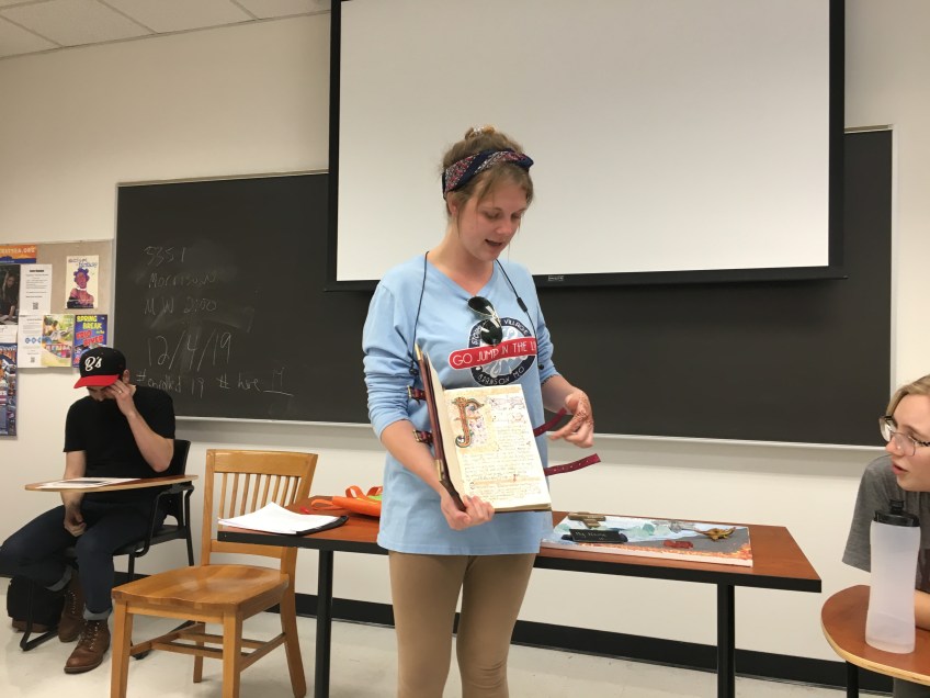IMG_6927 Published December 6, 2019 at 4032 × 3024 in My Amazing Students…Yet Again! Kandi and her astounding calligraphy of a beautiful, well-researched story. Her brother hand-sewed the book and its his leatherwork!!!!