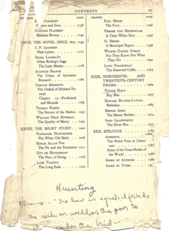I was flipping through the pages of my mother’s book from when she was a high school student in Chicago in the 1930s. I had held World Literature (edited by E. A. Cross, also 1935) numerous times. I opened it to gaze within, seeing her inscription: “Joan Wehlen October 26, 1938 U-High.” In the Table of Contents, she had transcribed this famous quote from Anatole France: “The law, in its majestic equality, forbids the rich as well as the poor to sleep under bridges, to beg in the streets, and to steal bread.” Coming from a family with socialist leanings in the wake of the Depression, this sentiment must have resonated. She also had transcribed the word “Hrunting”–the name of the sword loaned to Beowulf by Unferth.