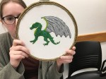 They made art, such as the painstaking embroidery that portrays the dragon, Beowulf, Grendel’s Mother, and Grendel’s arm, as Claire did.